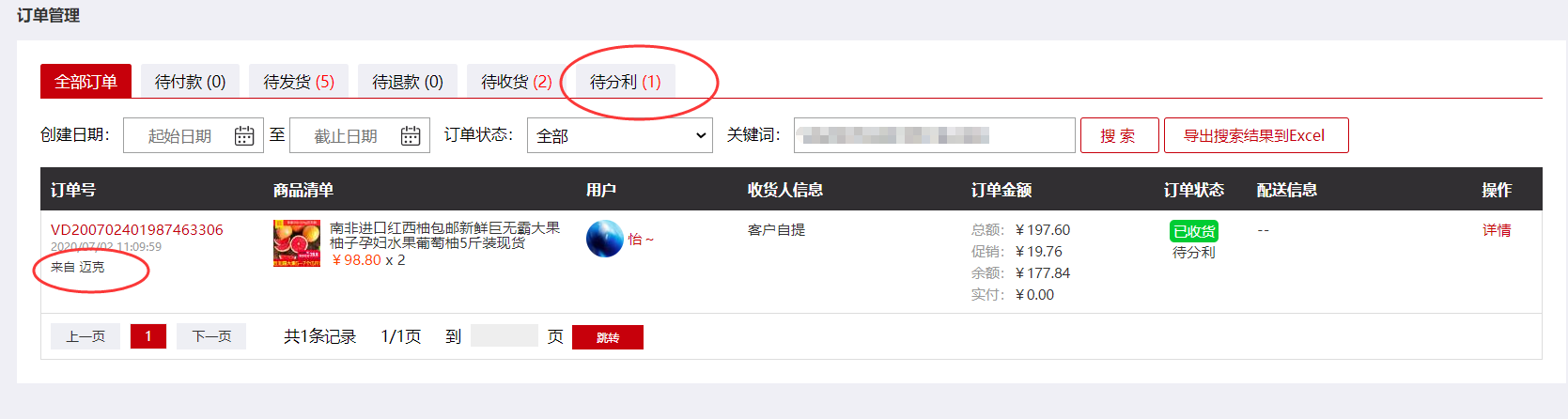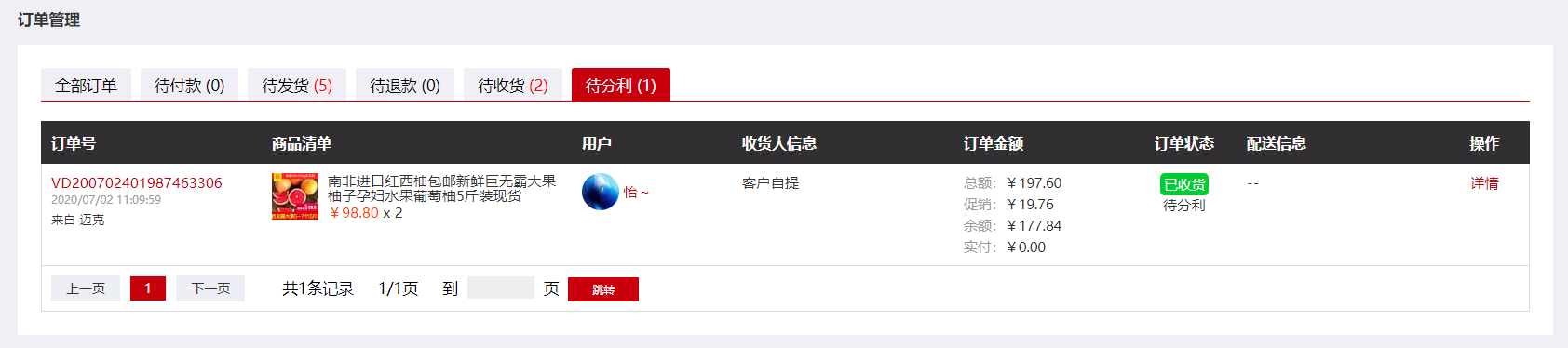 用户确认收货之后,商城管理员再次进入订单中心,这时便可以看到“待分利”订单,如下图: