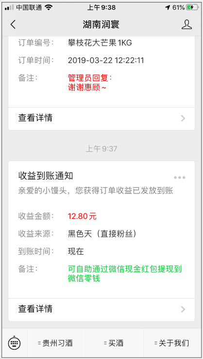 对于走分销流程的订单,当粉丝下单并支付成功时,系统会自动计算用户的所有上级可以获得的佣金金额,并给所有上级分销商推送订单收益通知。