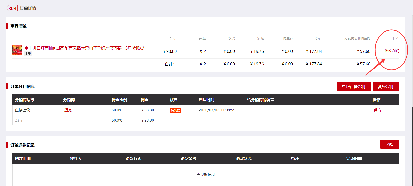 另外,订单如果有在线支付或余额支付的退款产生,系统也会自动重新计算分利。如果全部退款,则所有分利将会被取消。