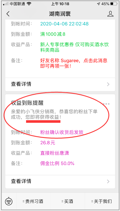 如果商城已配置微信模板通知,则此时分销商就会立即收到微信通知。如下图:
