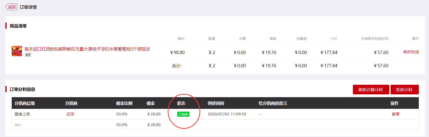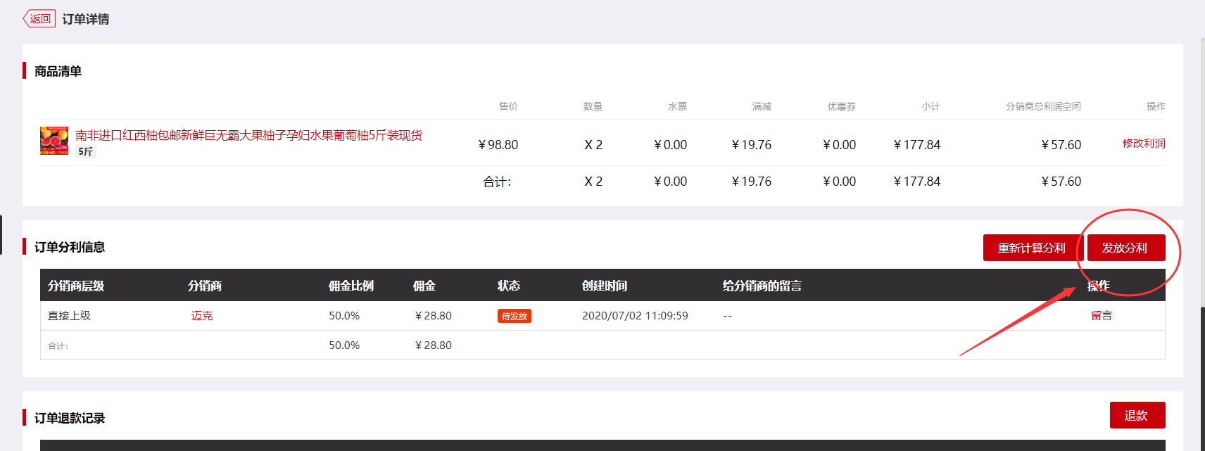 点击订单编号进入订单详情页,然后点击【发放分利】按钮,如下图: