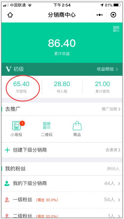 分销商进入分销商中心,然后点击【可提现】按钮: